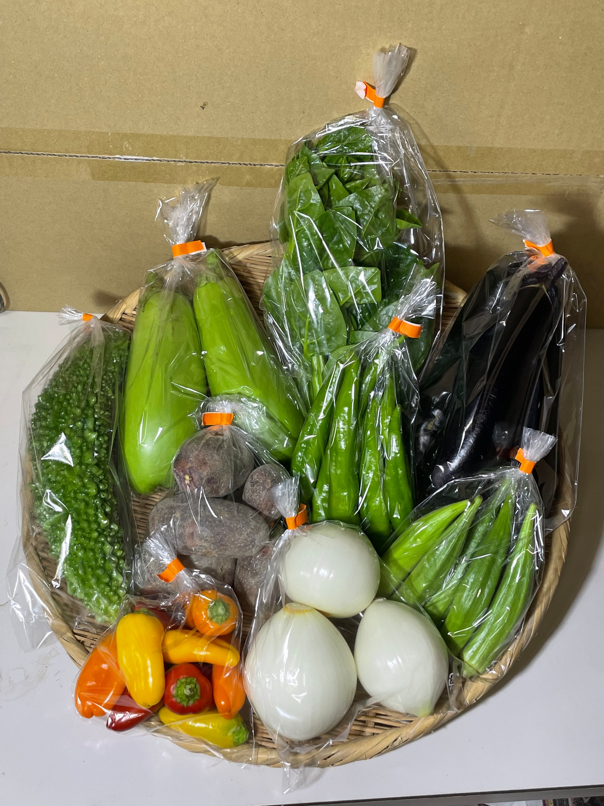 今回は玉ねぎ、東広島青なす、長なす、ミニパプリカ、万願寺とうがらし、ゴーヤ、じゃがいも、広島オクラ、ツルムラサキが入りました😁
